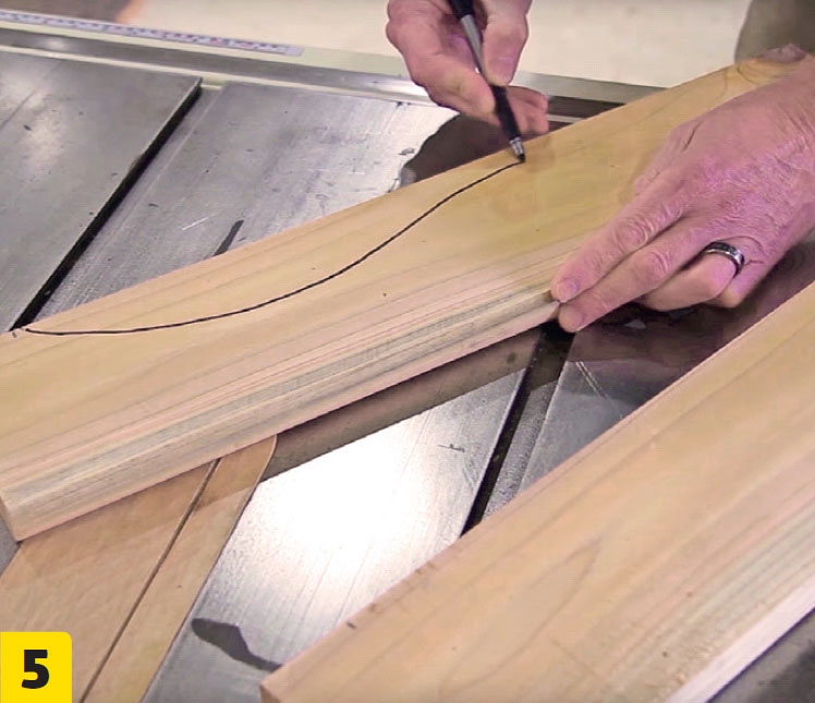 Muotoile jalat (F) makusi mukaan, mutta älä sahaa ruuvinreikien kohdalta. Tämän tuolin jalkoihin tehdään aaltomainen kuvio. Piirrä muoto toiseen jalkaan tussilla.