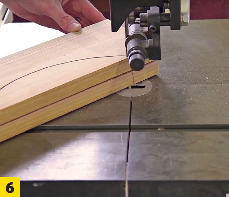 Aseta laudat (F) päällekkäin ja sahaa viivaa pitkin. Vannesahalla on helppo sahata tarkkoja kaaria, mutta voit muotoilla jalat myös pistosahalla. Laudat kannattaa kiinnittää yhteen kaksipuoleisella teipillä sahaamisen ajaksi, jotta ne pysyvät samalla kohdalla. Hio reunat ja nurkat sileiksi hioma-paperilla.
