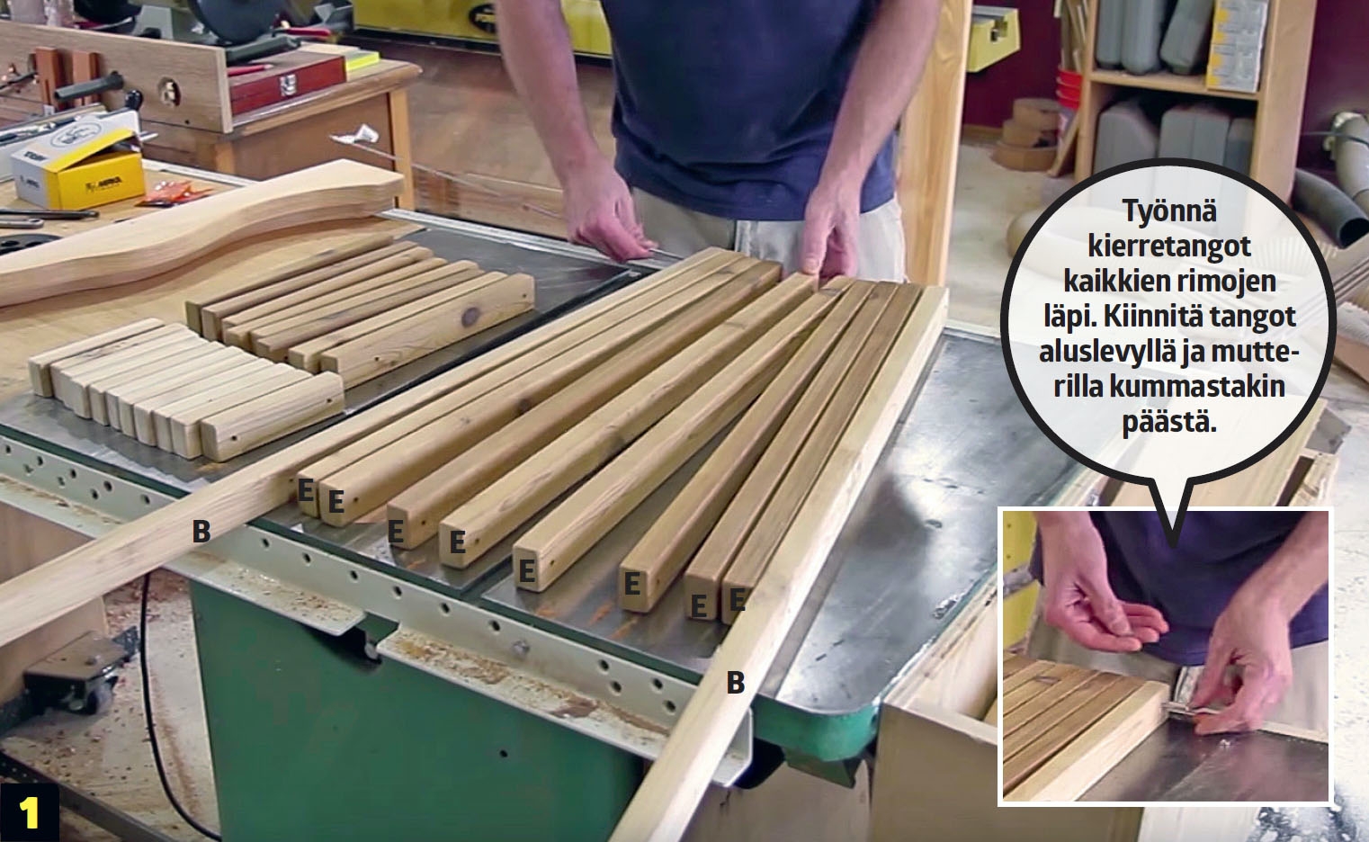 Levitä rimoja (E) alhaalta ja aseta lyhyet Arimat niiden väliin. Ruuvaa pari mutteria kierretangon toiseen päähän ja väännä kierretanko reikien läpi porakoneen avulla. Muista käyttää kuulosuojaimia, sillä rimat vinkuvat ja kitisevät julmetusti, kun tanko pyörii rei’issä!