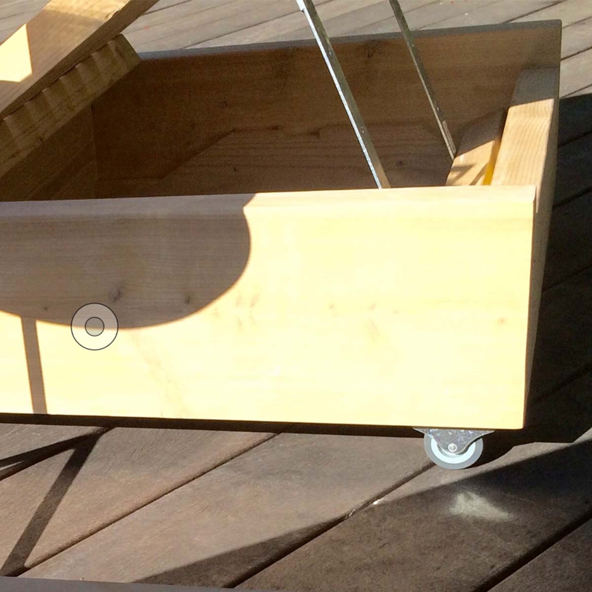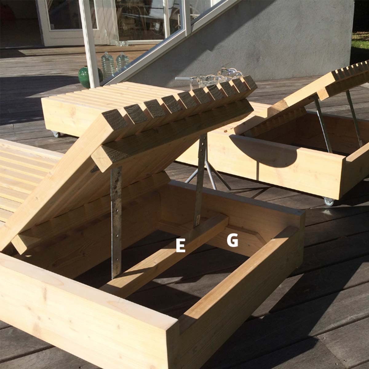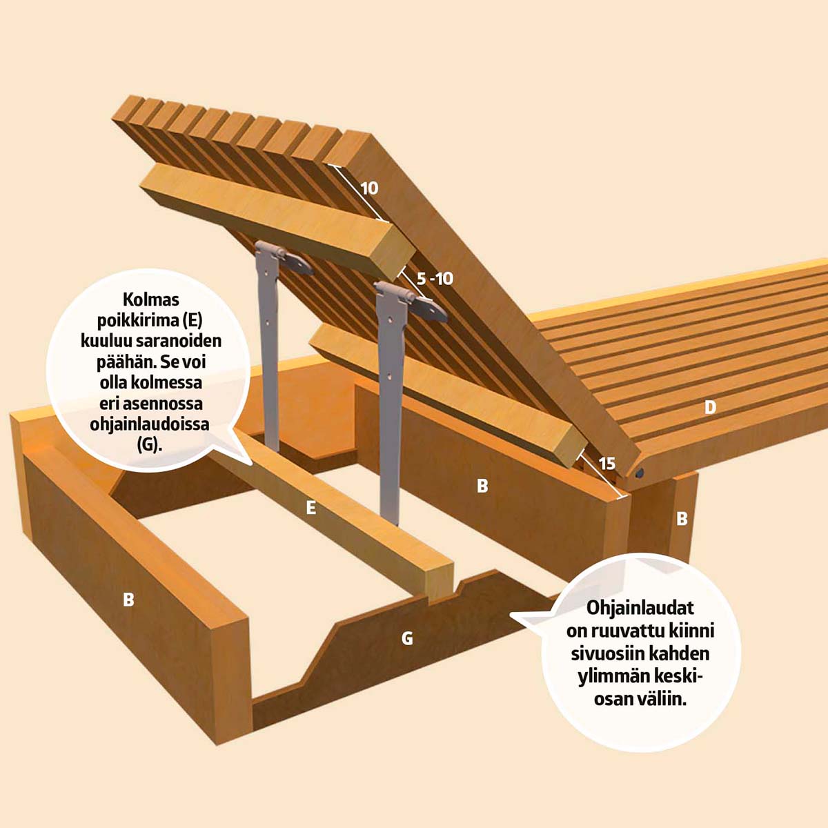 Kaksi isoa T-saranaa ruuvataan selkänojan (C) taakse. Saranat ruuvataan kiinni siten, että uloimmat ruuvinreiät ovat toiseksi uloimpien selkäosien kohdalla. Saranat ruuvataan kiinni 5–10 senttiä ylimmän poikkilankun (E) alapuolelle. Asenna sen jälkeen lankku saranoiden päähän siten, että ne voivat olla ohjausrimojen (G) päällä.