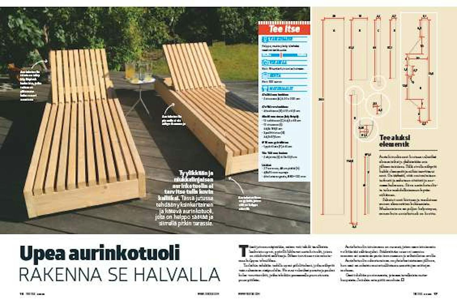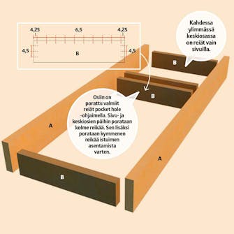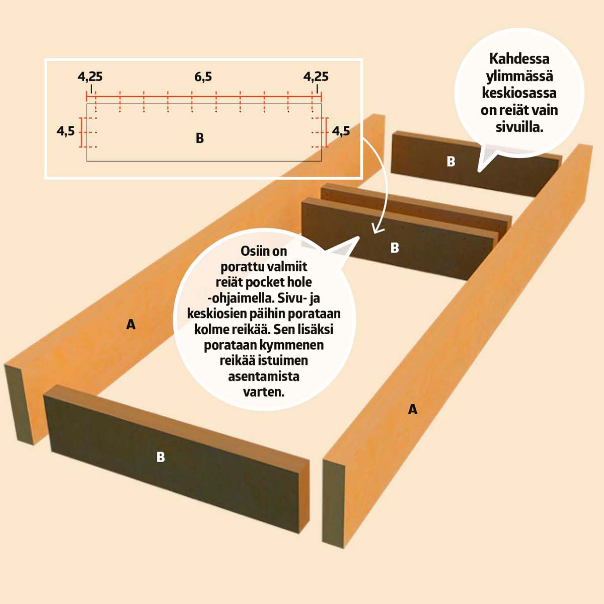 Aluksi tehdään aurinkotuolin runko. Se koostuu kahdesta sivuosasta (A) ja neljästä keskiosasta (B). Kaikki liitokset tehdään rungon sisäpuolelta ruuveilla, jotka asennetaan ruuvausohjaimella tehtyihin pocket holes -reikiin. Keskiosissa oleviin reikiin asennettavat ruuvit vetävät osat kiinni toisiinsa.