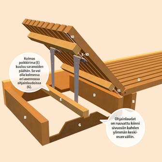Selkäosat (C) vahvistetaan kahdella poikkirimalla (E). Rimat asennetaan selkäosien poikki 15 senttiä saranasta (F) ja 10 senttiä yläreunasta. Rimat