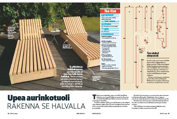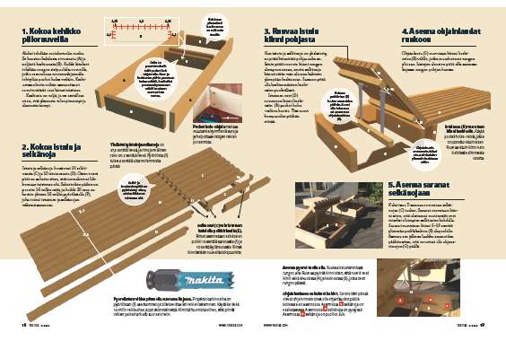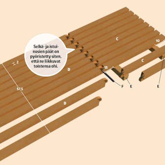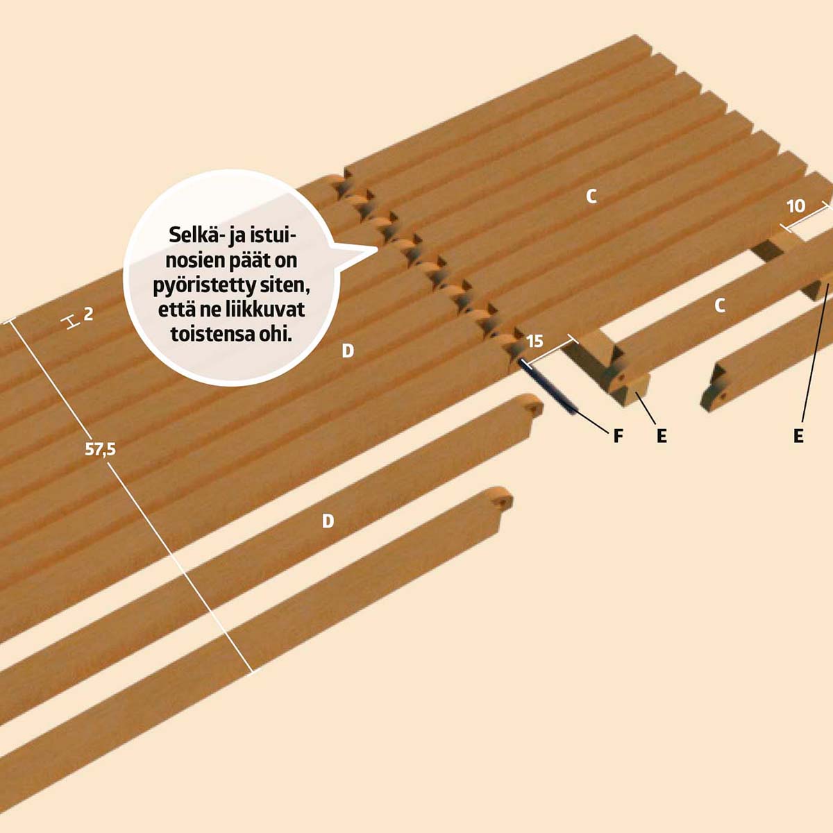 Istuin ja selkänoja koostuvat 10 selkäosasta (C) ja 10 istuinosasta (D). Osien toiset päät on sahattu siten, että ne mahtuvat liikkumaan toistensa ohi. Sahattuihin päihin on porattu 16 millin reiät, ja kaikki 20 osaa on koottu yhteen 16 millin pyörölistalla (F), joka toimii istuimen ja selkänojan välisenä saranana.