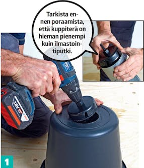 Poraa reikä paljun keskelle. Kuppiterän pitää olla pari milliä pienempi kuin ilmastointi putken, joka työnnetään reikään.