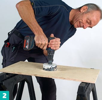 Seuraavaksi paljun pohjaan porataan reikä pöydän jalalle. Lisäksi tarvitaan teline, joka pitää paljun eli pöydän jalustan vaakatasossa sen aikaa, kun pöydän jalka on pystyssä levyn päällä hiekalla täytetyssä paljussa. Levyn pitää olla vaakatasossa, ettei pöydän jalasta tule vino.