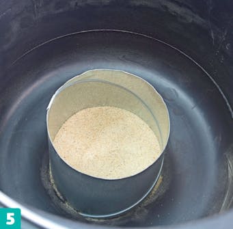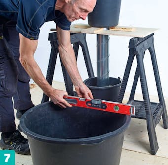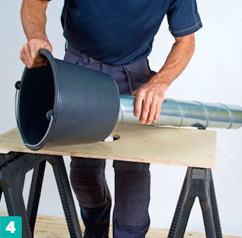 Työnnä putki levyn läpi hiekalla täytettyyn paljuun. Täytä suurin osa ilmastointiputkesta hiekalla. Tue ylempi palju paikalleen laudanpätkillä ja varmista, että putki on pystysuorassa.