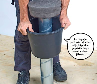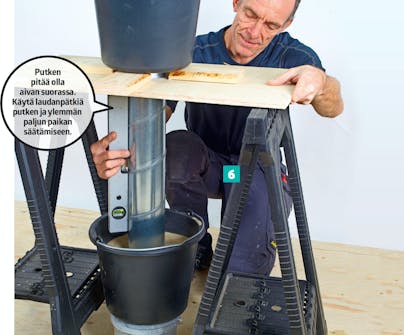 Poraa tai sahaa puulevyyn reikä. Nosta levy parin pukin varaan. Reiän pitää olla hieman putkea isompi.