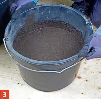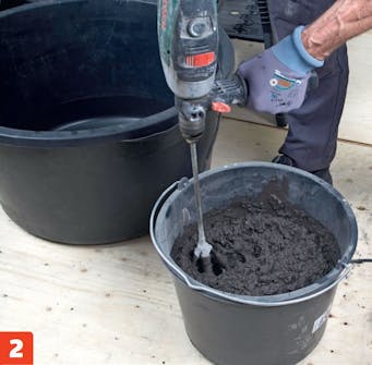 Sekoita betonia vähintään kolmen minuutin ajan porakoneeseen kiinnitetyllä vispilällä. Kaavi välillä paljun pohjalle juuttunut jauhe muun betonin sekaan laasti kauhalla.