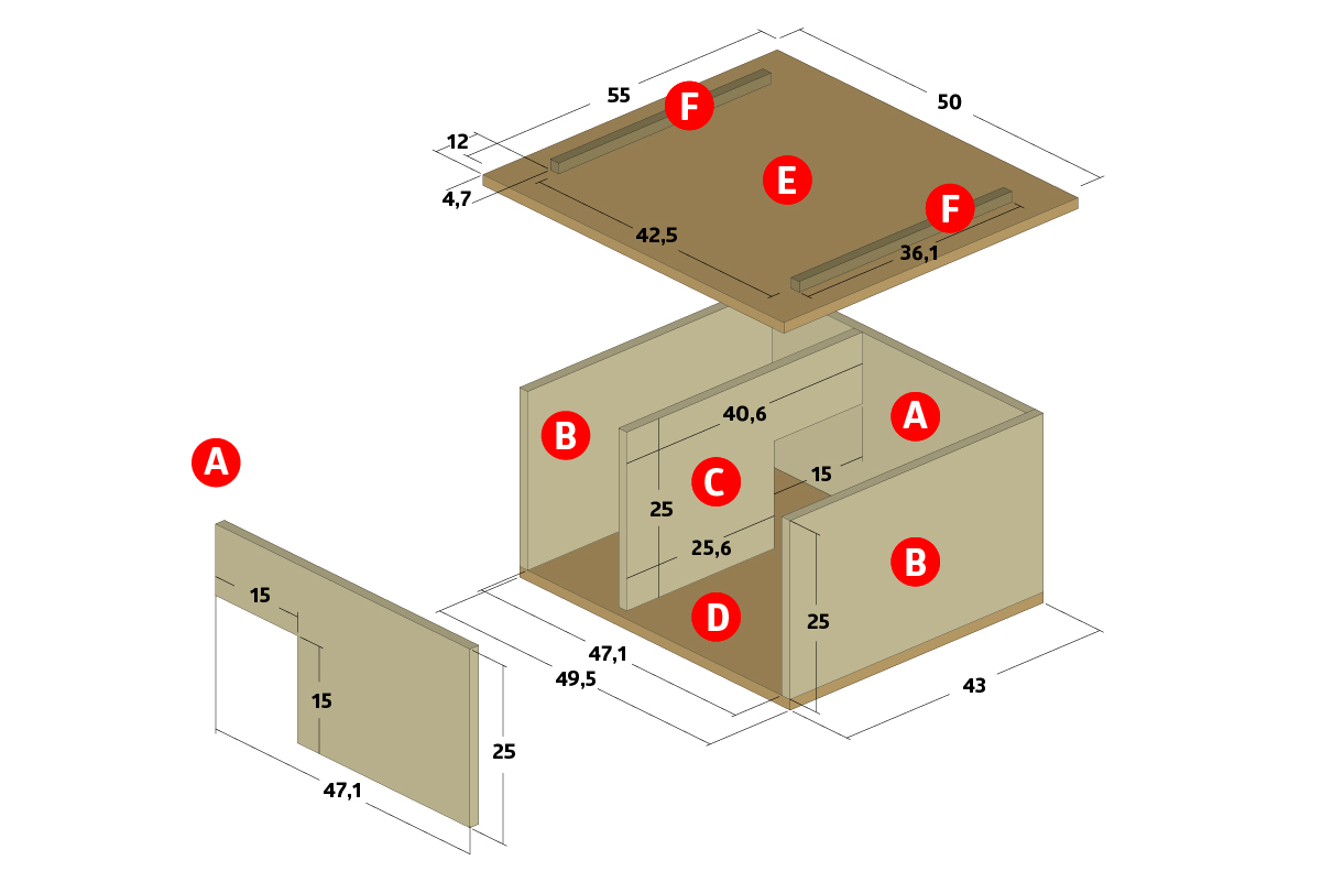 Kun olet yhdistänyt kaikki neljä seinää, voit käyttää niitä sapluunana, kun sahaat pohjaa (D). Se on helppo tapa varmistaa, että pohjasta tulee millintarkasti oikean kokoinen. Varmista, että seinät ovat suorassa kulmassa, kun merkitset mittoja.