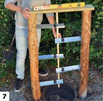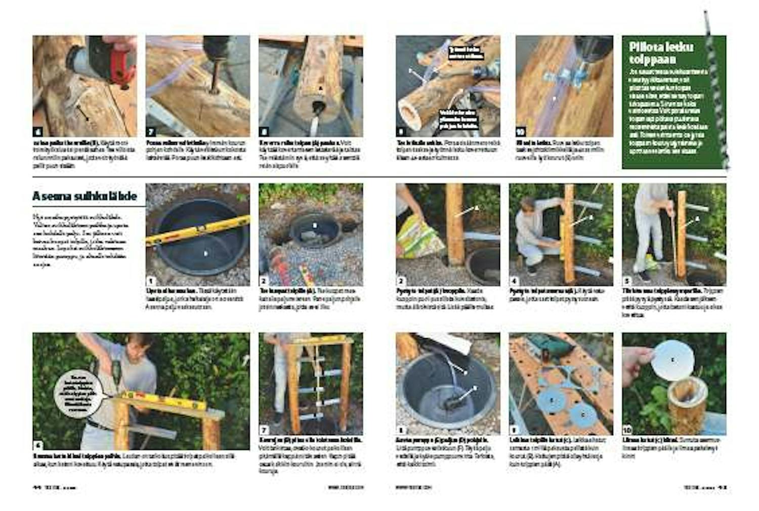 Projektin ensimmäisessä vaiheessa rakennetaan se suihkulähteen osa, joka näkyy maan pinnalla. Kuori aluksi kaksi pölkkyä ja poraa niihin reiät vesiletkuja varten. Sen jälkeen on aika muotoilla koristeelliset vesikourut (B), jotka asennetaan maahan upotettuihin tolppiin.
