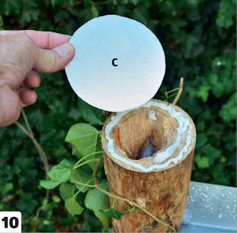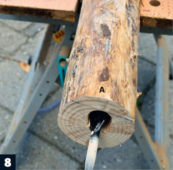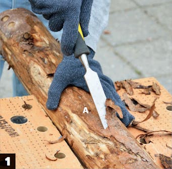 Kuori tolpat (A). Voit käyttää kuorimiseen talttaa. Jos puu on hieman kosteaa, kuori irtoaa melkein itsestään.