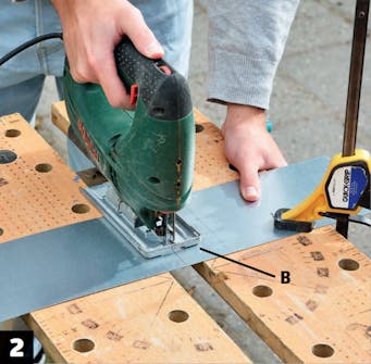 Sahaa kourut (B) sopivan pituisiksi. Se onnistuu helposti pistosahalla ja pienihampaisella metalliterällä.
