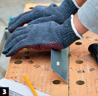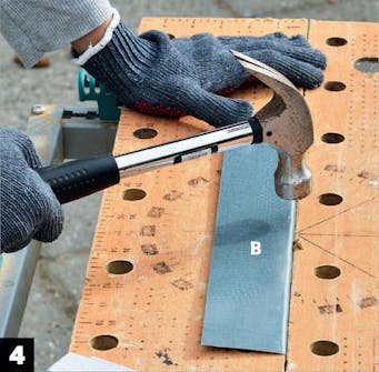 Taita kourut (B) keskeltä. Ota teräslevyt ja piirrä niiden keskelle merkit. Purista levy kiinni työpöytään tai kahden puun väliin ja taita levy 90 asteen kulmaan.