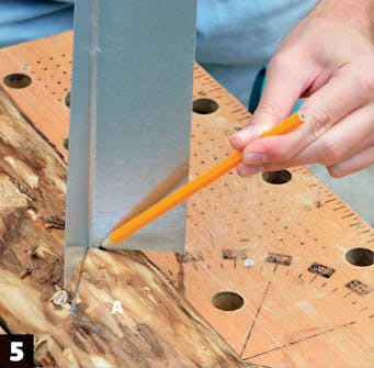 Tee tolppiin kourujen mentävät urat. Mittaa kourun (B) pään paikka. Pidä kourua paikallaan ja merkitse sen asennuskohta.
