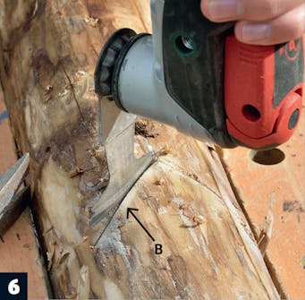 Sahaa paikat kouruille (B). Käytä monitoimityökalua tai pientä sahaa. Tee viilloista reilun millin paksuiset, jotta voit työntää pellit puun sisään.
