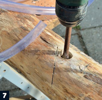 Poraa reikä vesiletkulle ylimmän kourun pohjan kohdalle. Käytä vesiletkun kokoista lattaterää. Poraa puun keskikohtaan asti.