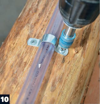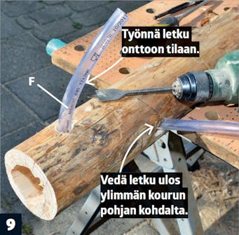 Tee letkulle aukko. Poraa sisäänmenoreikä tolpan taakse ja työnnä letku koverrettuun tilaan 45-asteen kulmassa.