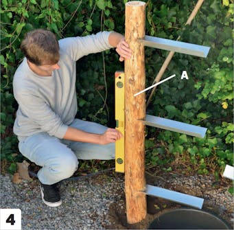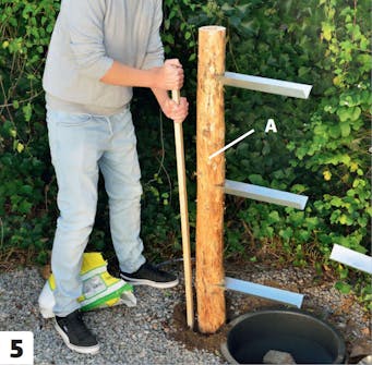 Tee kuopat tolpille (A). Tee kuopat maakairalla paljun viereen. Pane paljun pohjalle jotain raskasta, jotta se ei liiku.