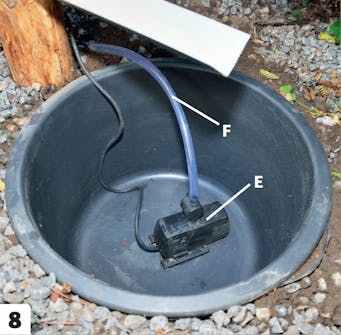 Aseta pumppu (E) paljun (D) pohjalle. Liitä pumppu vesiletkuun (F). Täytä palju vedellä ja kytke pumppuun virta. Tarkista, että kaikki toimii.