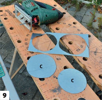 Leikkaa tolpille hatut (C). Leikkaa hatut samasta 1 milliä paksusta pellistä kuin kourut (B). Hattujen pitää olla yhtä isoja kuin tolppien päät (A).