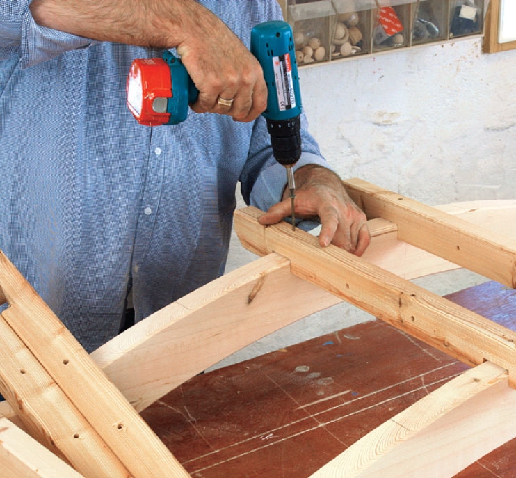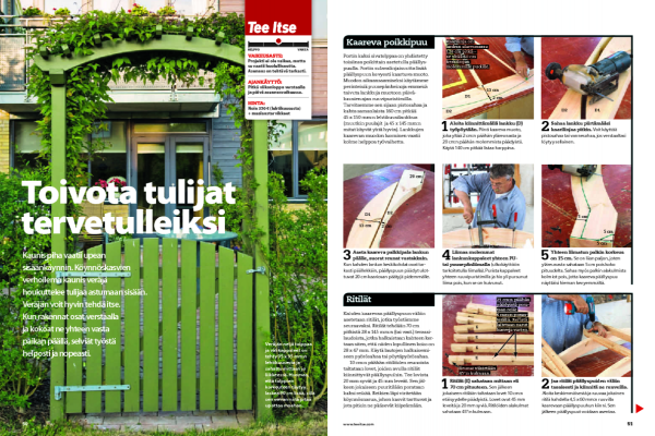 Kahden kaarevan päällyspuun väliin asetetaan ritilät, jotka työstämme seuraavaksi. Ritilät tehdään 70 cm pitkistä 28 x 145 mm:n (tai vast.) terassi-laudoista, jotka halkaistaan kahteen ker-taan siten, että niiden lopullinen koko on 28 x 47 mm. Käytä lautojen halkaisemiseen pyörösahaa tai pöytäpyörösahaa. 10 cm:n päähän ritilöiden reunoista taltataan lovet, joiden avulla ritilät kiinnittyvät päällyspuihin. Tee lovista 20 mm syvät ja 45 mm leveät. Sen jäl-keen jokaiseen puuritilään porataan kaksi reikää. Reikien läpi viritetään köynnösnarua, johon kasvit tarttuvat ja jota pitkin ne pääsevät kiipeämään.