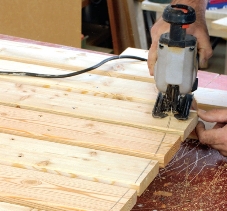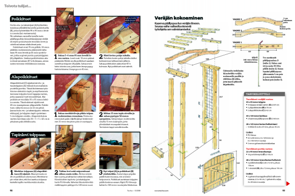 Portin kaksi sivutolppaa on yhdistetty toisiinsa poikittain asetetulla päällys-puulla. Portin sulavalinjaisuutta lisää päällyspuun kevyesti kaartuva muoto. Muodon aikaansaamiseksi käytämme perinteisiä puusepänkeinoja emmekä taivuta lankkuja muotoon päivä-kausien ajan ruuvipuristimilla. Tarvitsemme sen sijaan pistosahaa ja kahta samanlaista 160 cm pitkää 45 x 150 mm:n lehtikuusilankkua (muutkin puulajit ja 45 x 145 mm:n mitat käyvät yhtä hyvin). Lankkujen kaarevan muodon luominen vaatii kolme helppoa työvaihetta.
