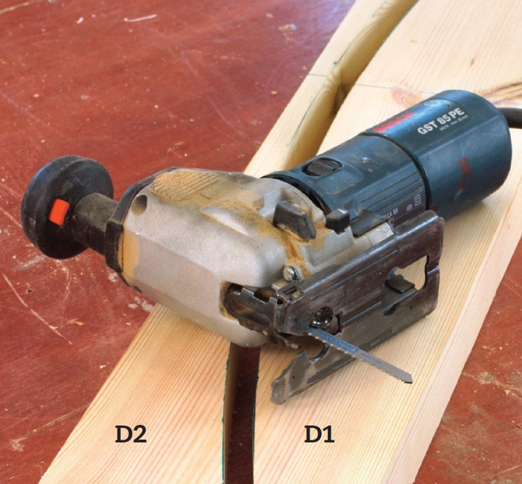 Sahaa lankku piirtämääsi kaarilinjaa pitkin. Voit käyttää pistosahaa tai vannesahaa, jos verstaaltasi löytyy sellainen.