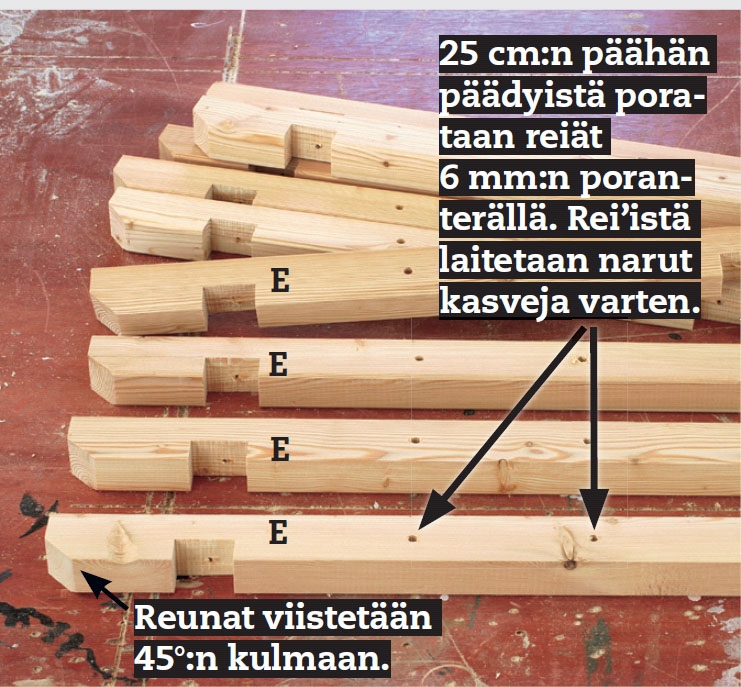 Ritilät (E) sahataan mittaan eli 70 cm pituuteen. Sen jälkeen jokaiseen ritilään taltataan lovet 10 cm:n etäisyydelle päädyistä. Lovet ovat 45 mm leveitä ja 20 mm syviä. Ritilöiden alakulmat sahataan 45°:n kulmaan.