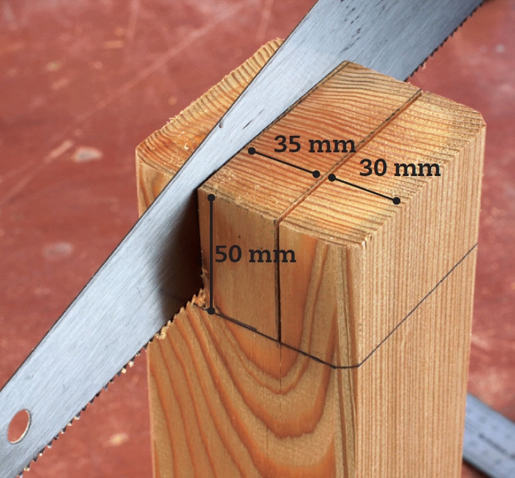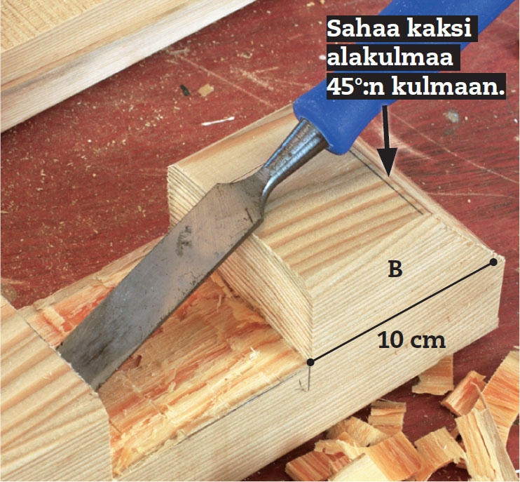 Sahaa 5-6 uraa 95 mm leveää lovea varten. Lovet ovat 10 cm:n päässä päädyistä. Niiden avulla poikkituet saadaan asetettua tolppien (A) päälle. Sahaa ensin kaksi ulointa uraa, jotta loven leveys pysyy halutunlaisena. Urasyvyys on 45 mm.