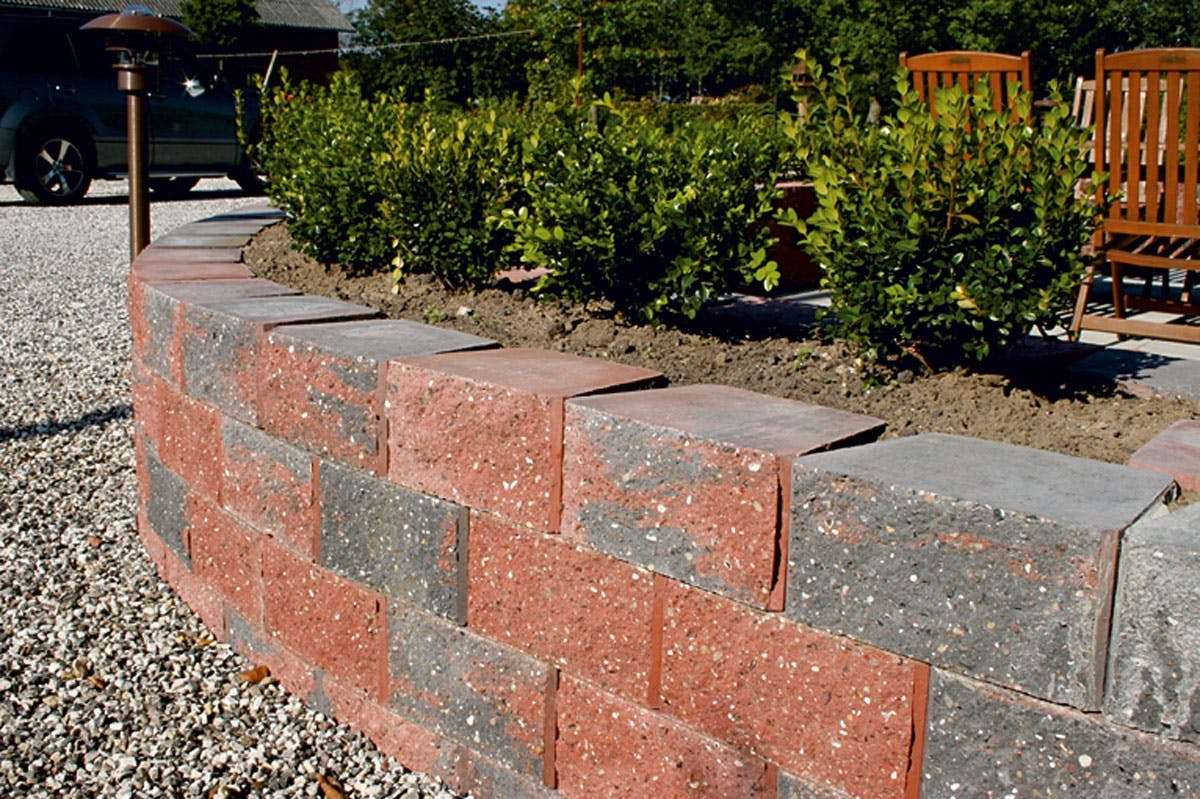 Danblokke-, Scanstone- ja vastaavilla tukimuuriharkoilla ensimmäinen ker-ros asetetaan tasaisesti maakosteaan betoniin. Asennusnystyrän ansiosta seuraava kerros painuu automaattises-ti hieman taaksepäin suhteessa etureu-naan. Näin syntyy noin 10:n prosentin kallistus kuin itsestään. Tarkka kallistus-prosentti riippuu harkkotyypistä. Muurin taakse tulee sijoittaa vähintään 10 cm:ä leveä kerros tiivistettyä soraa ja mahdollisesti pohjalle myös salaojaputki, jos rinteestä erittyy paljon vettä.