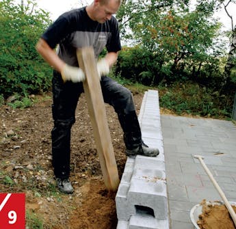 Täytä muurin tausta murskeella, särekivillä tai muulla läpäisevällä aineksella. Tausta täyte-tään aina routimattomalla maa-aineksella. Muurin taakse kannattaa tehdä salaojitus, varsinkin, jos muurin takana on rinne.