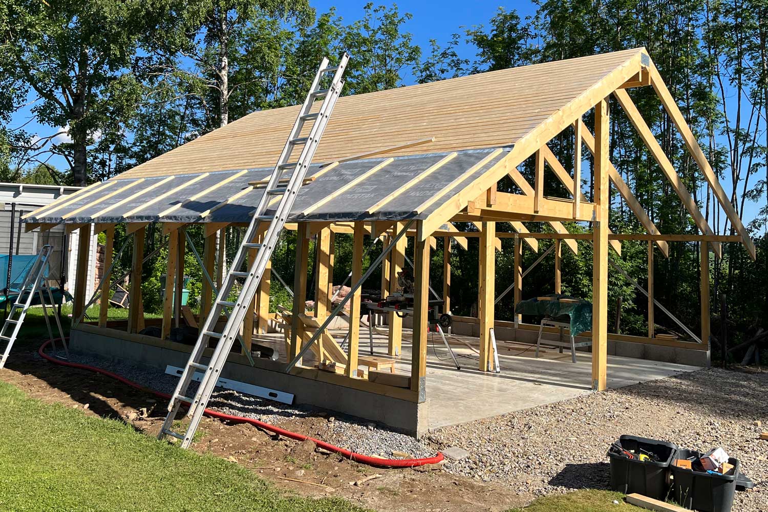 Autokatoksen seinät on tehty tässä vinovuorilaudoista, katto pellistä ja aluskate raakapontista.