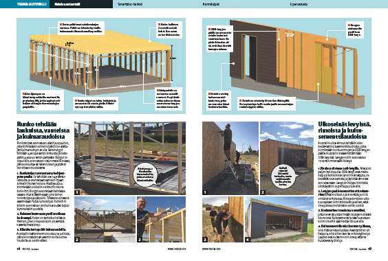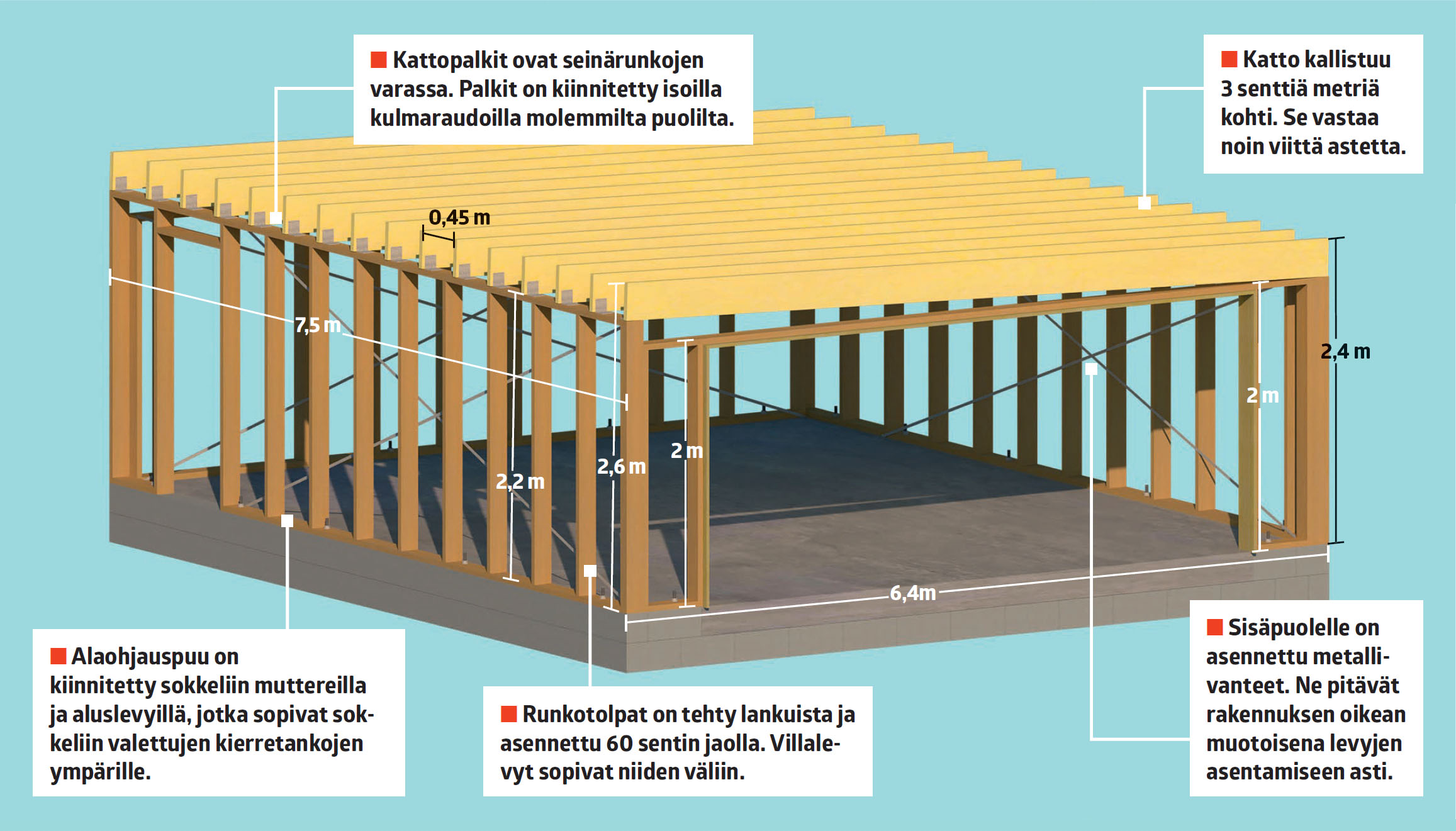 Runkotolpat asennetaan alaohjauspuuhun, joka kiinnitetään sokkeliin betoniin valettujen kulmarautojen avulla. Seinärungot tehdään 4,8x14,8 sentin lankuista ja kattopalkit 4,8x29,5 sentin palkeista. Rungon sisäpuolelle asennetaan ristiin metallivanteet, jotka vakauttavat rakennuksen ja pitävät sen oikean muotoisena.
