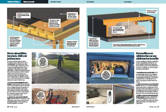 Autotallin ulkoverhous tehdään säänkestävistä kuitusementtilaudoista, jotka kiinnitetään koolausrimojen ja OSB-levyjen päälle. Autotallin sisäseinät tehdään OSB-levyistä. Levyjen väliin asennetaan 10 sentin mineraalivillalevyt.