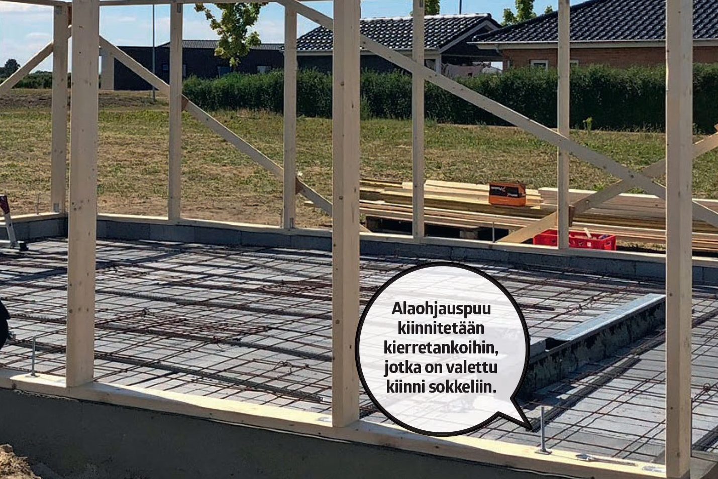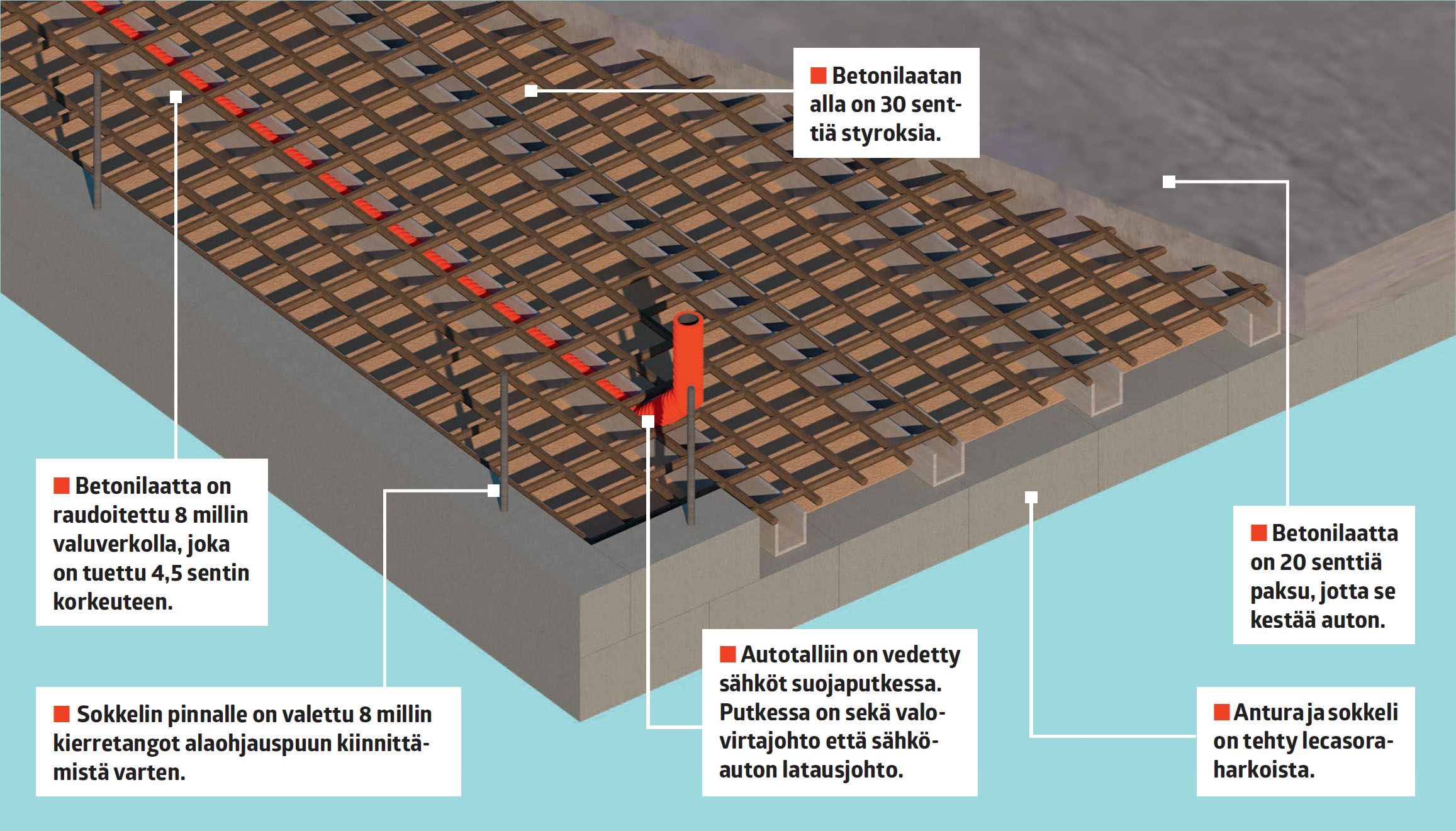 Autotallin pohjalla on eristetty betonilaatta, jossa on 30 senttiä styroksia ja 20 senttiä betonia. Laatta on valettu kolmikerroksisen lecaharkkosokkelin sisäpuolelle. Sokkeliin valetaan kierretangot myöhempää käyttöä varten.