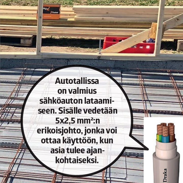 Talliin on asennettu varaus teholaturia varten. Tallissa ei ole ainakaan vielä sähköautoa, mutta siihen on asennettu valmiiksi teholaturille tarvittavat sähköt (16 ampeerin sulakkeet ja 5x2,5 mm²:n asennusjohto). Se tarkoittaa, että sähköasentaja voi asentaa teholaturin helposti, kun sille tulee tarvetta.
