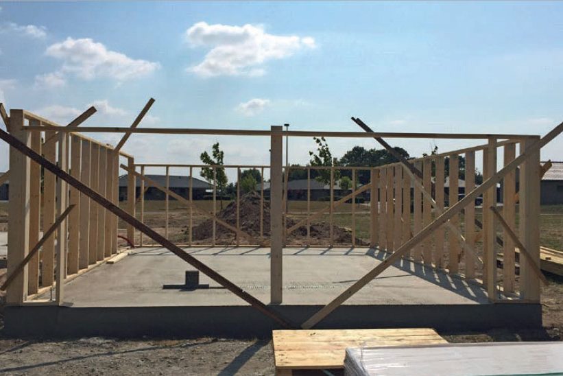 Rakennuksen vasen puoli on oikeaa korkeampi. Katon on tarkoitus kallistua hieman, joten oikea seinä on 20 senttiä vasenta matalampi.