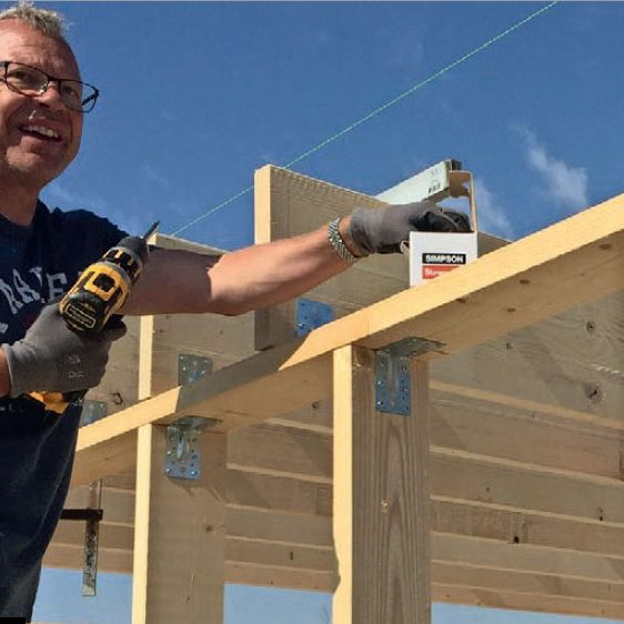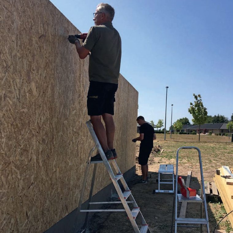 Runko peitetään OSB-levyillä. Niissä on paljon hyviä puolia. OSB-levyt ovat melko halpoja esimerkiksi vaneriin verrattuna, ne kestävät ruuvaamista ja jäykistävät varaston rakenteen. Levyt on helppo kiinnittää ulkokäyttöön sopivilla puuruuveilla.