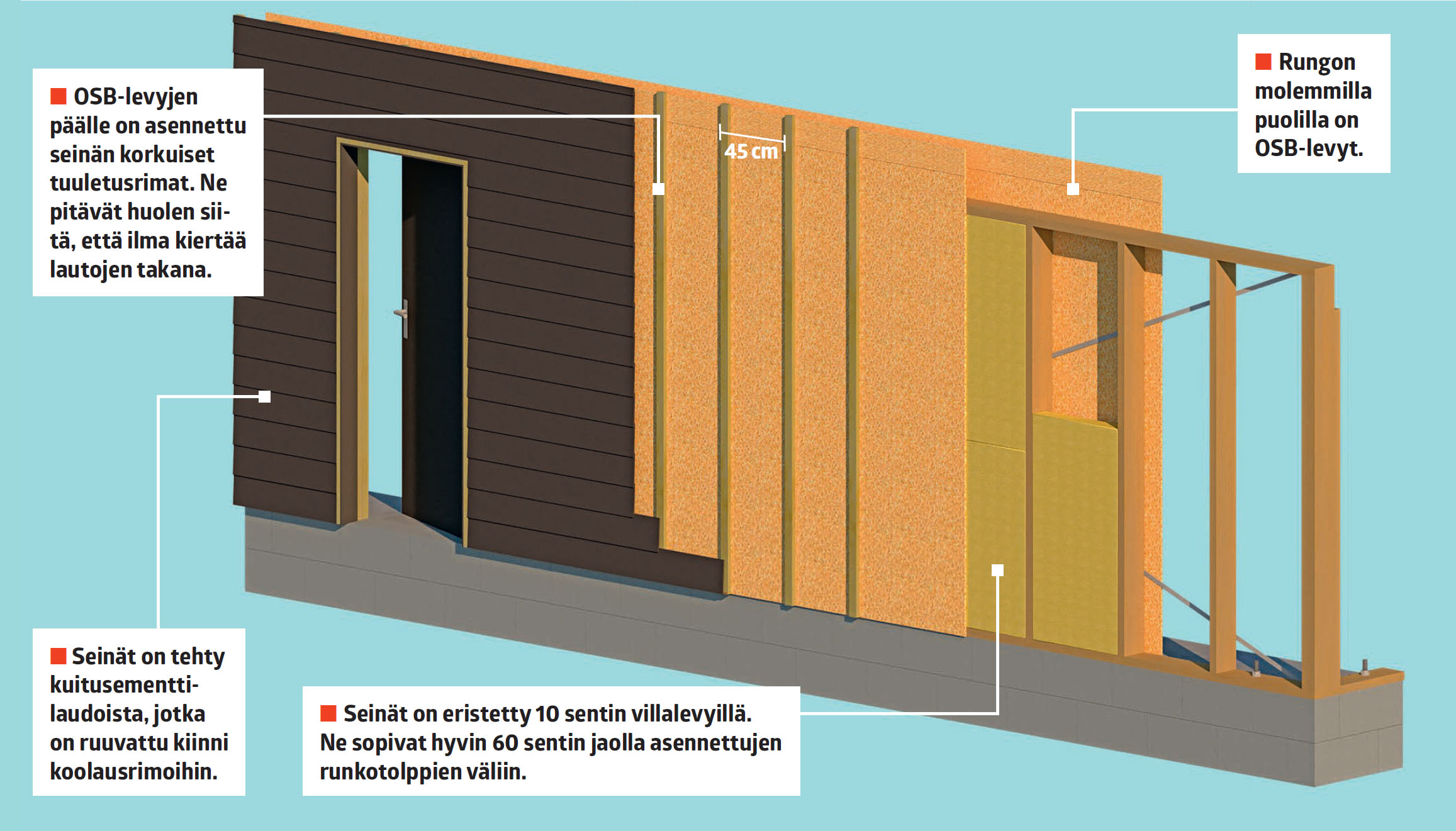 Ulkoseinät levyistä, rimoista ja kuitusementtilaudoista
