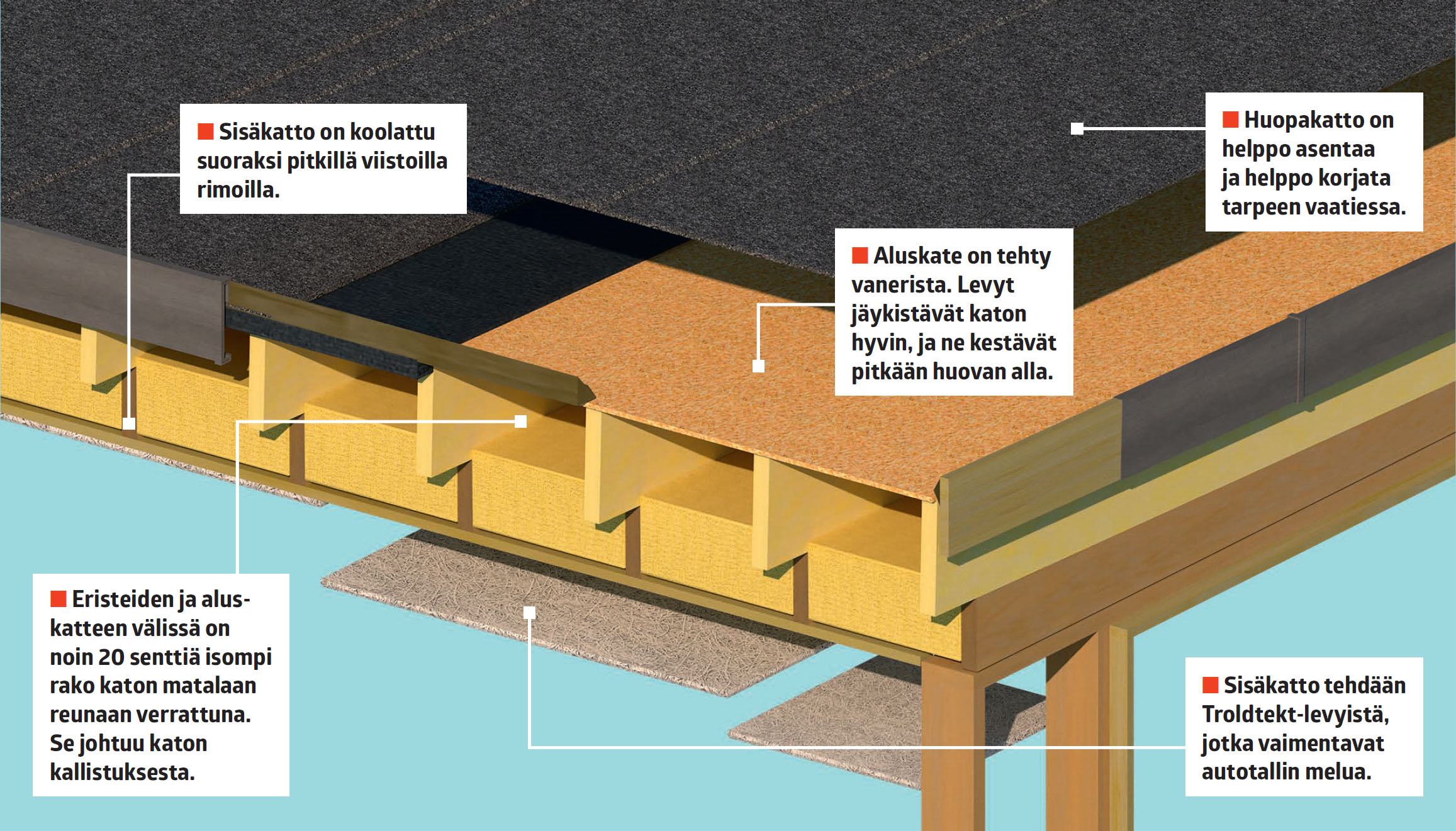 Autotalliin tehdään kaksikerroksinen huopakatto, joka poltetaan kiinni vanerialuskatteeseen kaasupolttimella. Katon reunoille asennetaan otsalaudat ja kolmiorimat, joiden päälle asennetaan mustat räystäspellit. Kattopalkkien alapuolelle asennetaan poikittaiset koolauslaudat, jotka kannattelevat sisäkattoa. Katto koolataan vaakasuoraksi pitkällä kiilalla, joka on samassa kulmassa kattopalkkien kanssa. Kattoon asennetaan 20 senttiä mineraalivillaa. Lopuksi koolauslautoihin kiinnitetään ääntä vaimentavat Troldtekt-levyt.