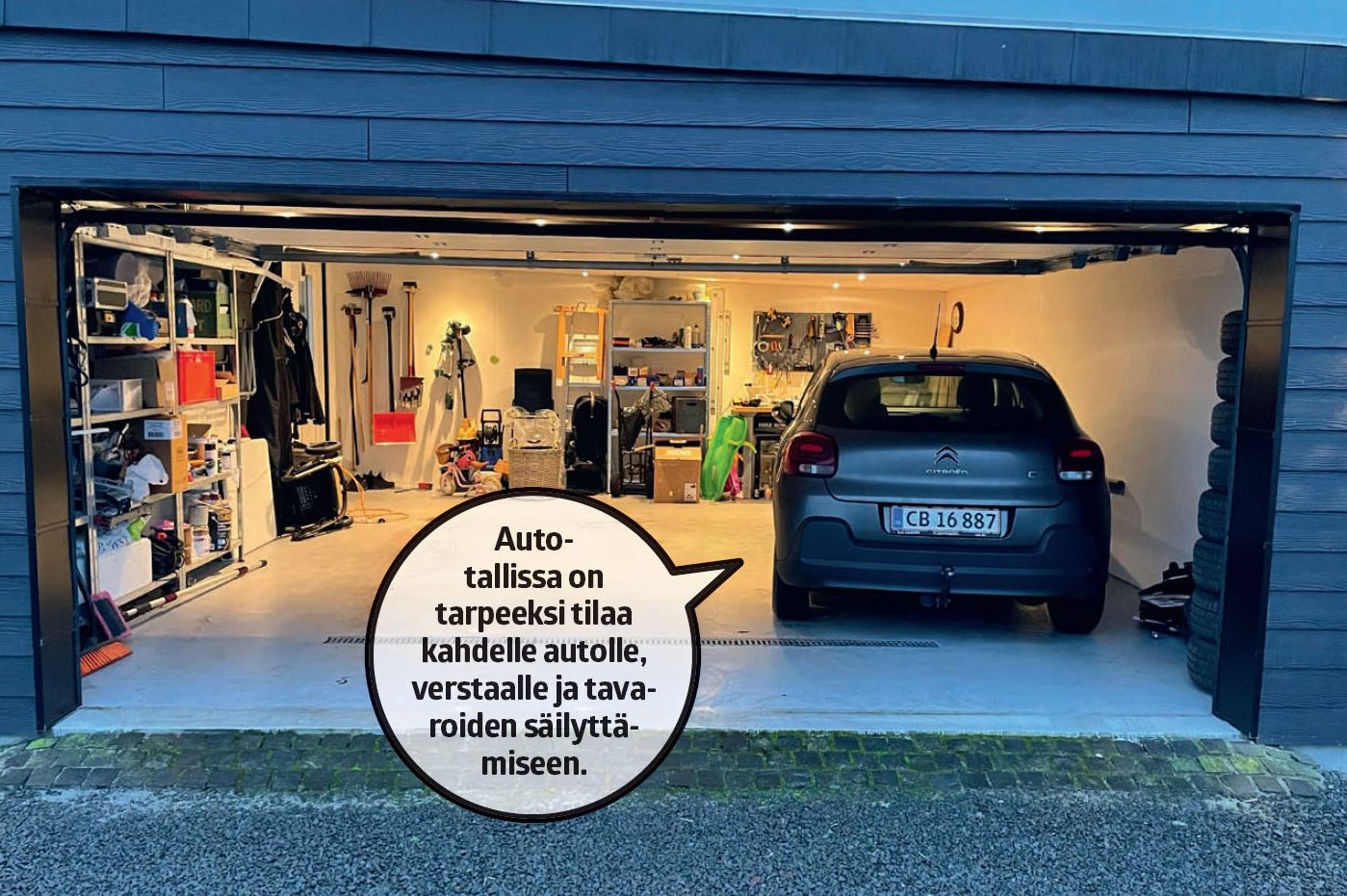 Autotallista tulee monitoimitila. Tallin etupuolelle asennetaan kauko-ohjattava ovi. Talliin mahtuu helposti kaksi autoa ja säilytyshyllyjä. Autotallissa on lisäksi paljon valoja, joten sitä voi käyttää myös verstaana, kun yksi tai kummatkin autot ovat ulkona.