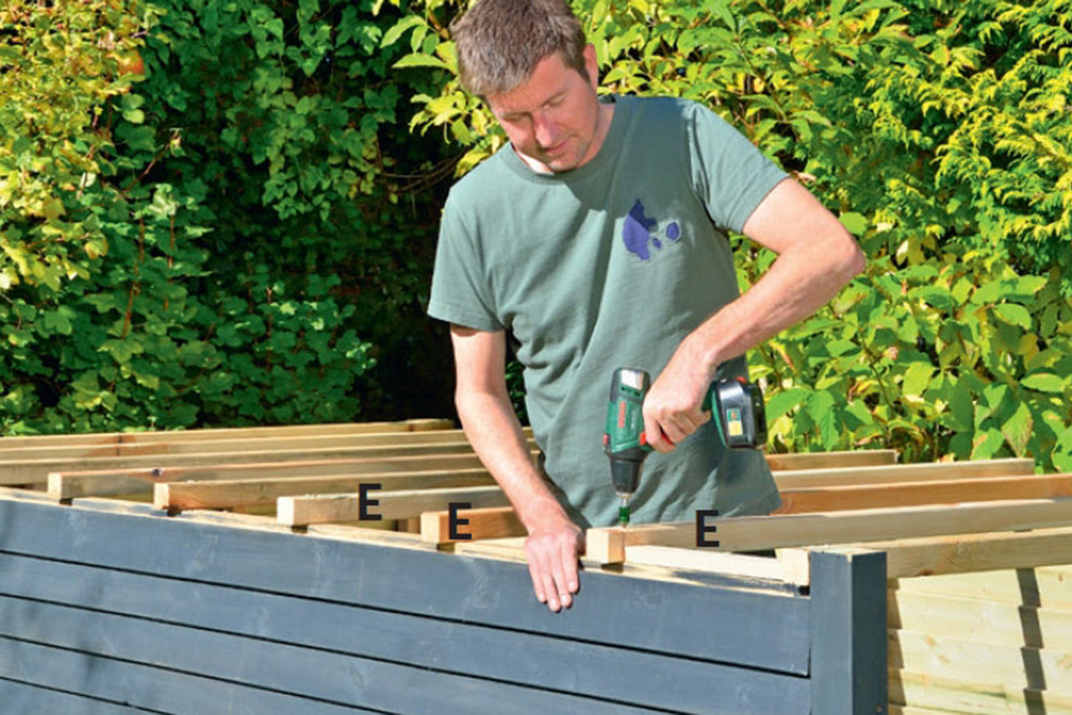 Mittaa kattopalkkien (E) paikat ja ruuvaa ne kiinni 5x80 millin ruuveilla. Voit sahata sopivan välikapulan ja merkitä tolpan-pätkien paikat sen avulla.