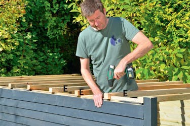 Nosta seinät paikoilleen pilarikenkiin. Varmista vatupassilla, että seinät kallistuvat hieman taaksepäin, jotta sadevesi valuu pois vajan katolta.