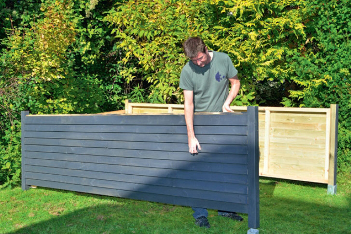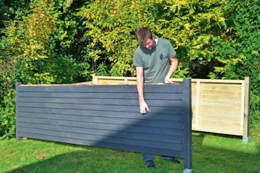 Sahaa seiniin tarvittavat osat ja poraa niihin valmiit ruuvinreiät. Merkitse aluksi ruuvien paikat. Kuvassa ensimmäinen seinä on kokoamista vaille valmis. Kaikki seinät kootaan samalla tavalla.