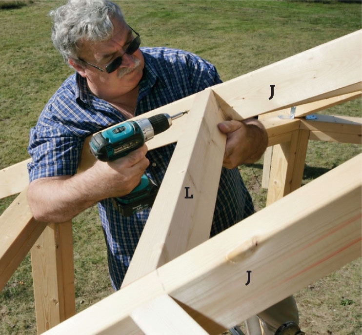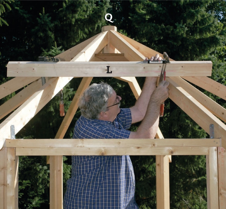 Ennen kuin aloitamme katon verhoilun, asennamme räystäslaudat. Niitä asennetaan yhteensä kahdeksan, koko paviljongin ympäri.
