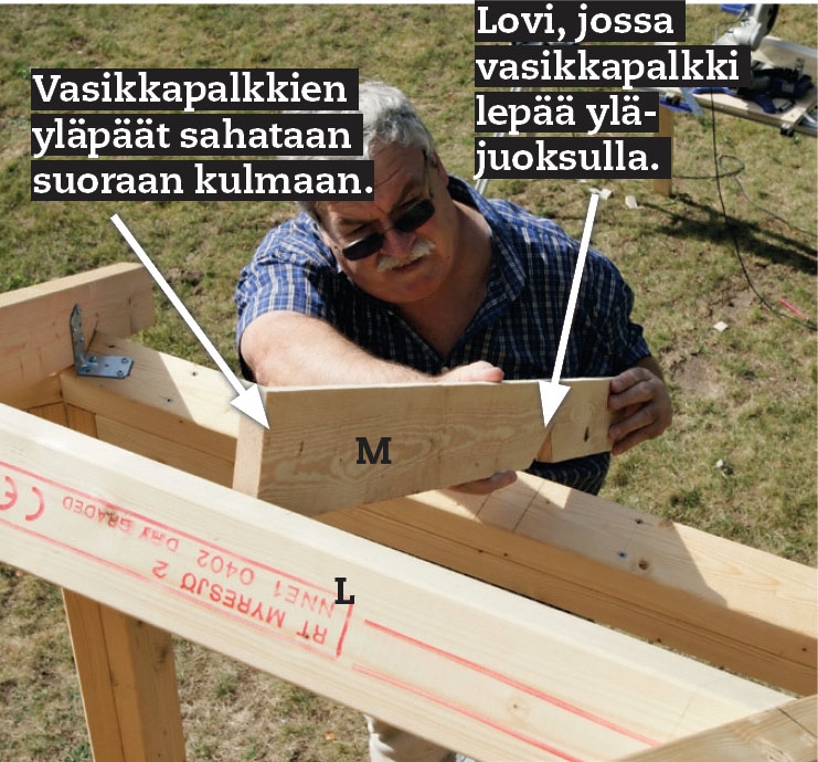 Aseta vasikkapalkki (M) vaihtopalkille (L) ja merkitse lovikohta ja kohta, jossa palkki lepää seinän yläjuoksun päällä. Sahaa lovi ja tarkista, että se sopii.