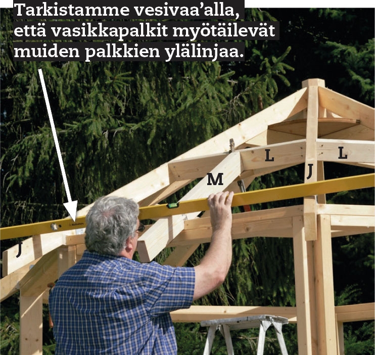 Tarkista ohjainkiskolla, että vasikkapalkit (M) tulevat samaan korkeustasoon kattovasojen (J) kanssa. Tarkista myös palkkien pituus, jotta ne eivät työnny liian pitkälle ulos, kun tuulilautoja ryhdytään asentamaan.