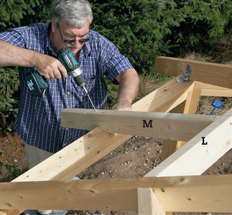 Kiinnitä vasikkapalkit (M) vaihtopalkkeihin (L) 5 x 100 mm ruuveilla vaihtopalkkien läpi ja yhdellä 5 x 120 mm ruuvilla loven läpi yläjuoksuun (F).