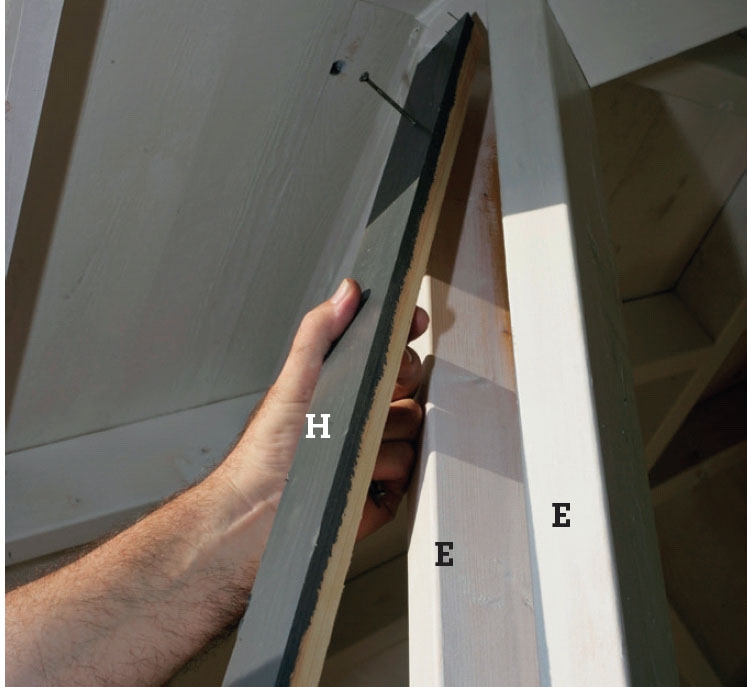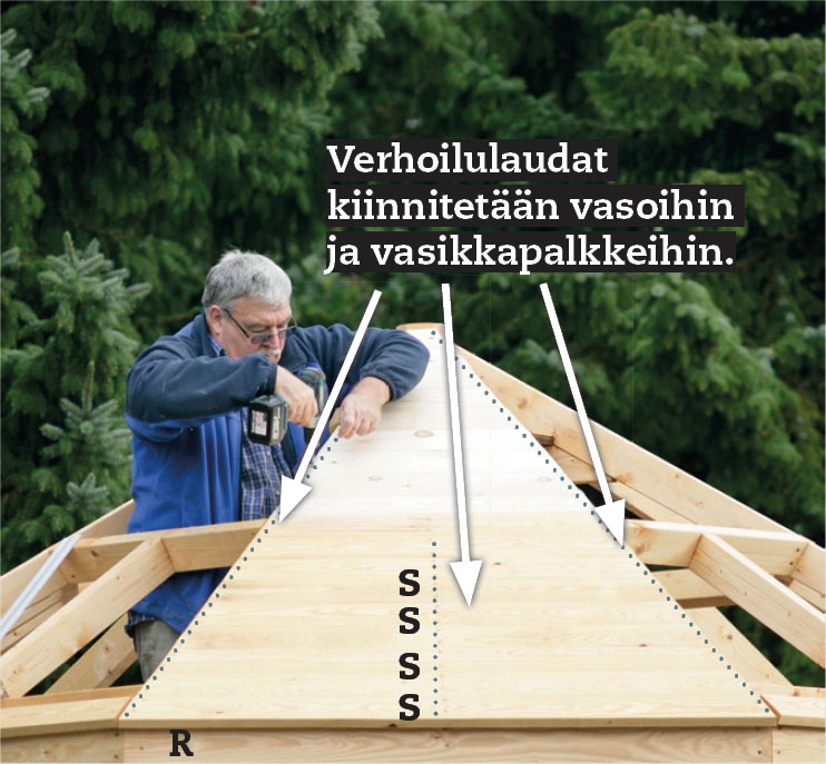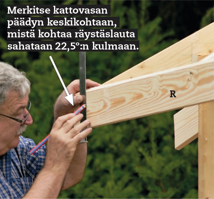 Kiinnitä ensimmäinen räystäslauta (R) väliaikaisesti ja tee lautaan sahausmerkinnät. Sahaa päät 22,5°:n kulmaan ja viistä yläreuna 30°:n kulmaan. Kiinnitä lauta ruuveilla ja jatka samaan tapaan seuraavalla laudalla.