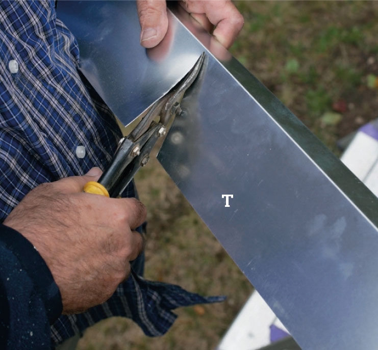 Leikkaa räystäspelti (T). Räystäspeltiä myydään L-muotoisena, metrin pituisena alumiiniprofiilina. Sitä on helppo leikata levysaksilla. Leikkaa profiilin pitkään sivuun viilto siihen kohtaan, josta peltiä pitää taittaa huvimajan kulmassa.